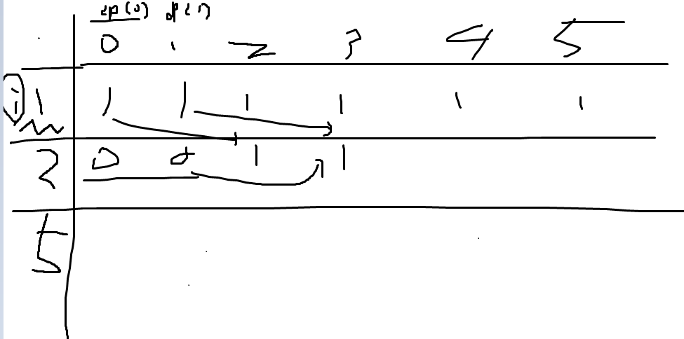 그다음 2원짜리 코인으로 2원을 최소 한개이상 포함해서 10원까지 만들 수 있는 경우의 수는 0 1 은 2원이 포함되지 않으니 0으로 설정되어야 한다. 그 이후 2원부터는 저위의 그림처럼 가져온다는 것을 알 수 있다.