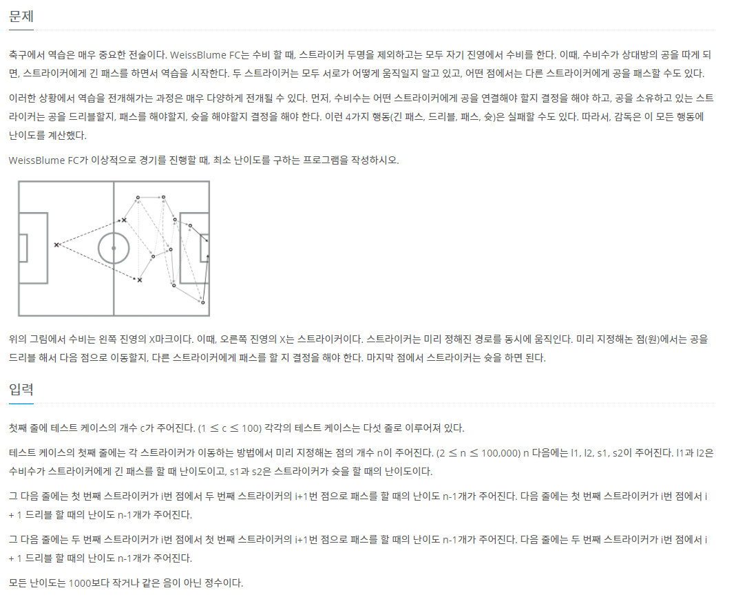 dp[1][i] = min(dp[2][i - 1] + p2ps[i-1],dp[1][i-1]+p1dr[i-1]);//1한테패스해서 드리블 하냐 패스하냐