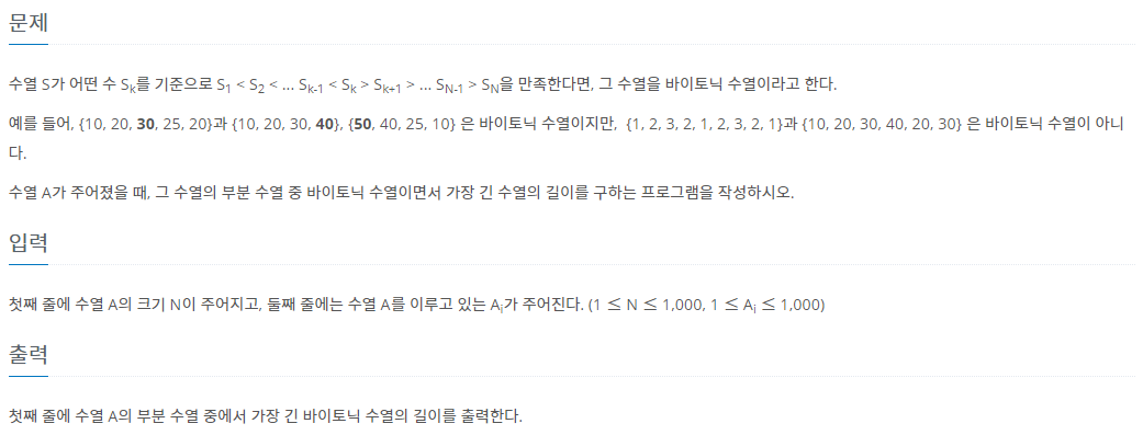 배열 예시를 앞에서 보면, 증가하는 수열을 구한 후 감소하는 수열을 구해줘야 한다.