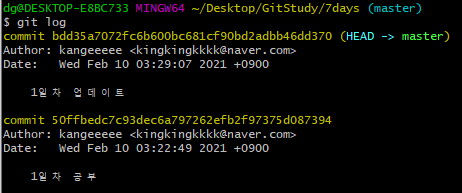 git log 명령어를 이용해 지금까지 커밋을 확인해봅니다.