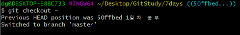 즉 checkout 명령어를 사용해서 원하는 커밋 시점으로 파일을 되돌릴 수 있다.
