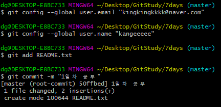 버전 관리를 위해 내정보를 등록하는 과정과 첫 번째 커밋을 만드는 과정입니다.