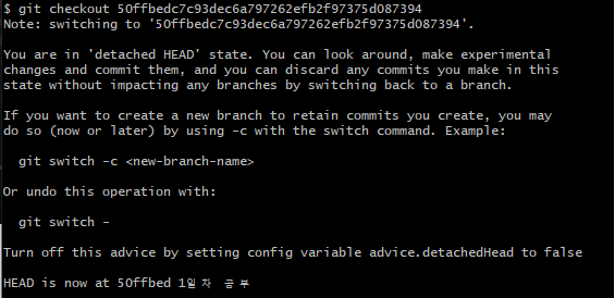 git checkout 아이디를 입력 후 마지막 라인에 head~ 텍스트가 보이면 성공적으로 첫 번째 커밋으로 돌아간 걸 확인할 수 있습니다. ( readme 텍스트 확인 )